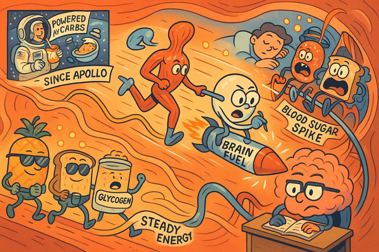 炭水化物は身体の主要な燃料源で、すみやかにグルコースに変換されます。グルコースは脳から筋肉まであらゆる器官を動かすエネルギー源です。果物、ご飯、全粒粉パンなど炭水化物を摂ると、消化器官がこれをグルコースに分解し、血流を通じて即エネルギーとして使うか、筋肉や肝臓にグリコーゲンとして蓄えます。