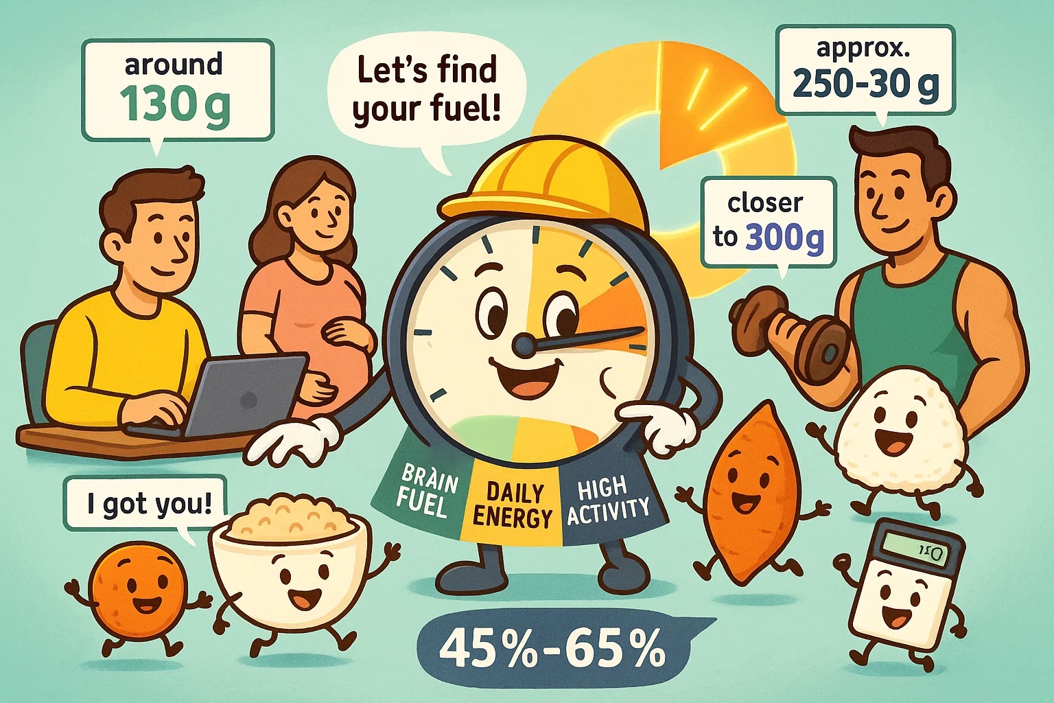 しかし、一般的な科学的ガイドラインはあります。米国のDietary Guidelines for Americansによれば、多くの人は総カロリーの45%〜65%を炭水化物から摂ることが推奨されています。つまり: